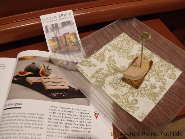 Au fil des pages et des rues, nous avons savouré un kougelhopf (vraiment très très bon), du foie gras, des bretzel, du pain d’épice, de la charcuterie, etc. L’accueil varie d’une boutique à l’autre. Certains commerçants nous considèrent comme n’importe quel client, d’autres tentent de nous faire sortir un peu vite. Certains prennent le temps de nous présenter leur produit, de répondre à nos questions. De même, les produits à tester sont différents d’un établissement à l’autre, un ridicule morceau de pain d’épice chez l’un, une belle assiette de charcuterie chez l’autre.